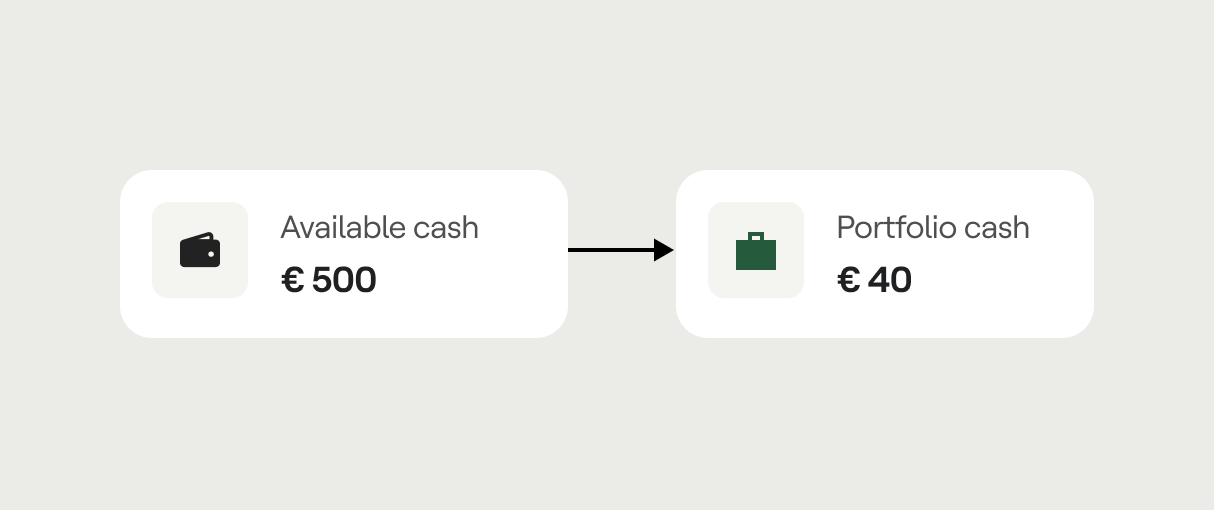 Je geld wordt verplaatst van je beschikbare saldo naar het geld in je gekozen Portefeuille en begint daarna automatisch te beleggen volgens de instellingen van de Portefeuille.